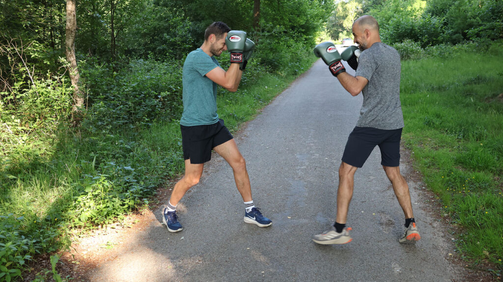 Oefenvormen uit boksen en zelfverdediging gebruik ik graag. Maar ik zoek vooral met je waar jij affiniteit mee hebt.